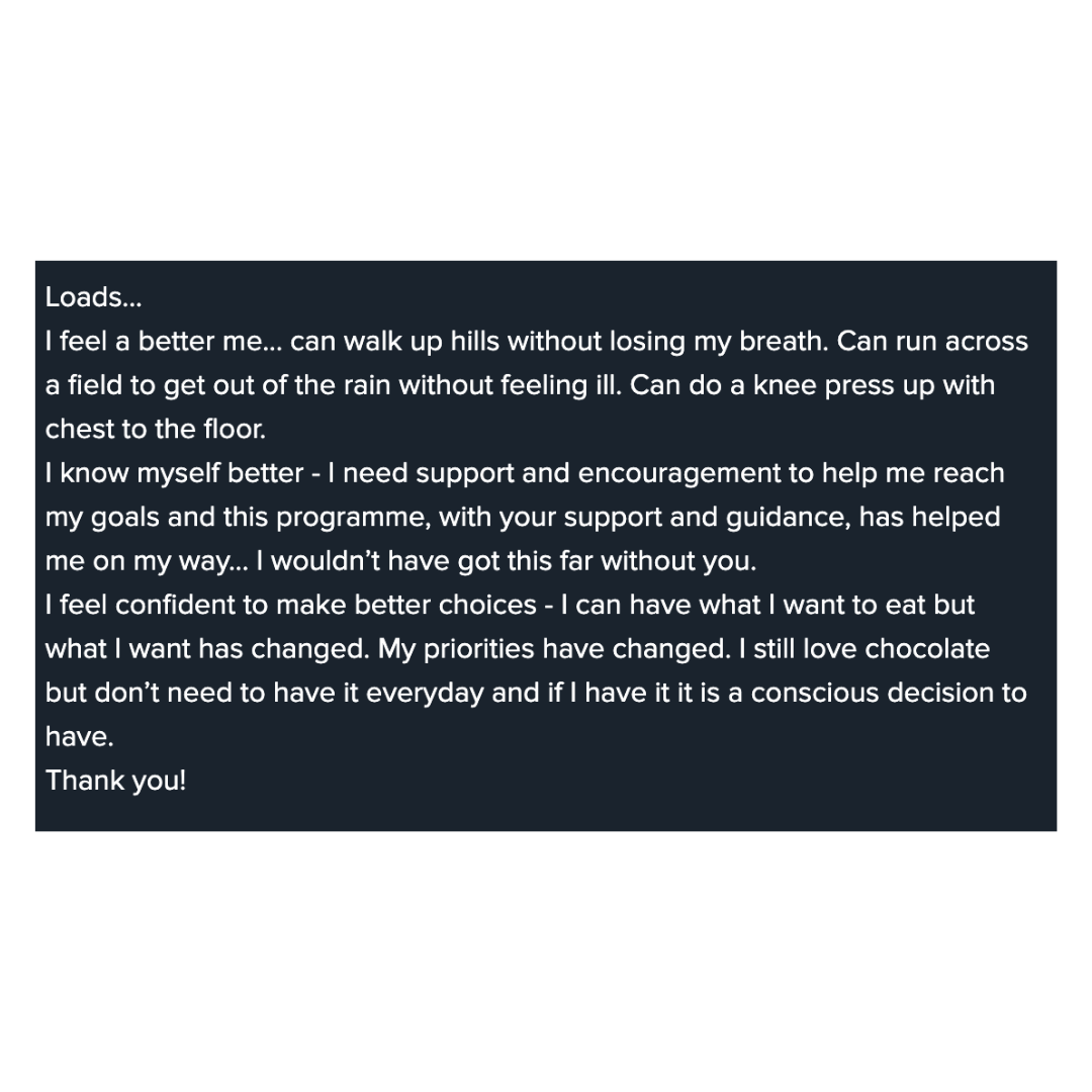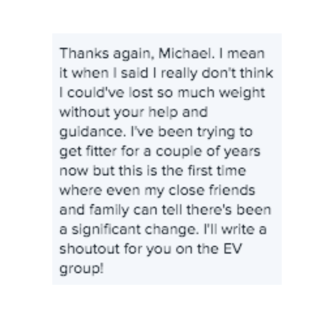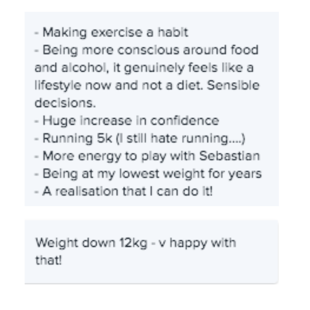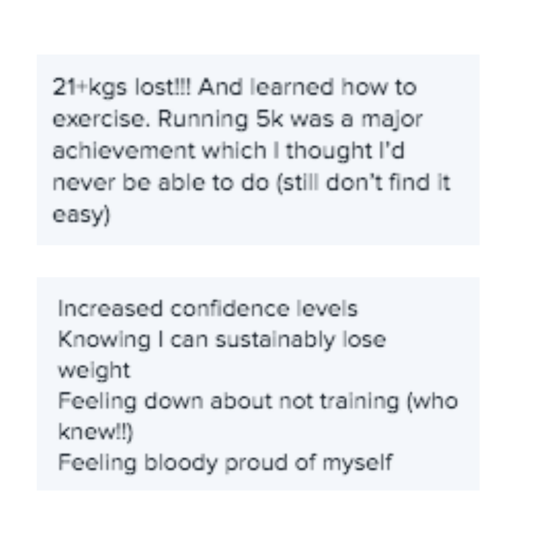 "Feeling a lot more confident with my overall appearance. I don't feel I need to hide behind baggy T-shirts and hoodies to hide my stomach.